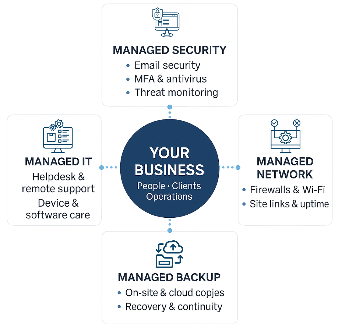 Running a business today means juggling users, devices, apps, networks, cybersecurity, and backups, all while trying to keep your team productive and your data safe.
